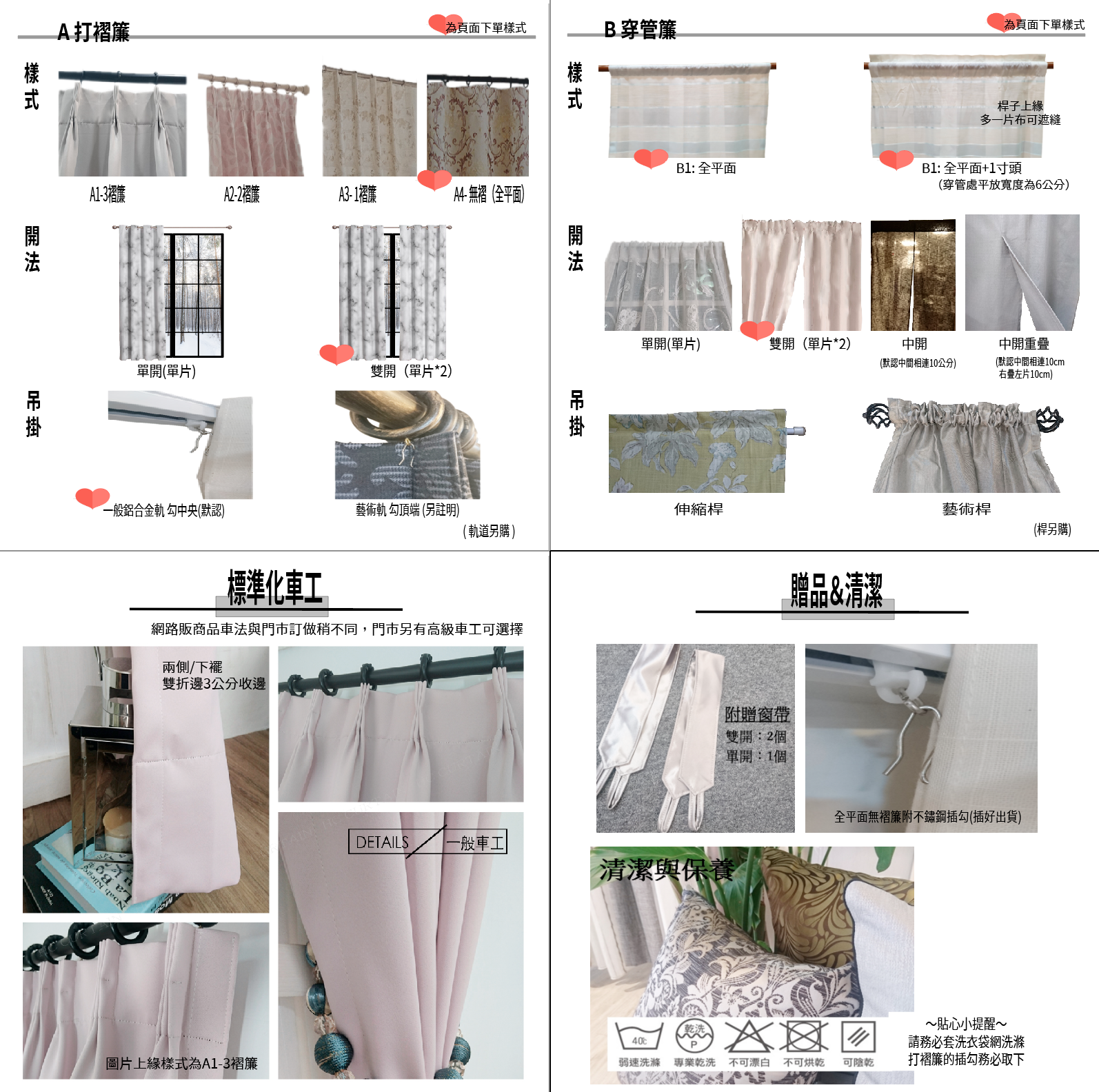 打褶簾可選上緣打1褶、無褶。穿桿簾、洞環簾可選全平面、微波(皺)。S簾可選間距8公分以上,深度10的淺波。