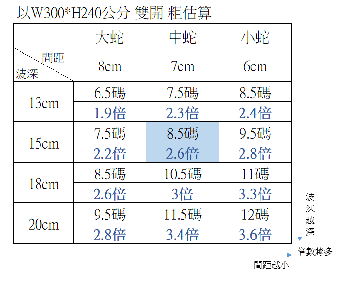 將波浪密度(間距)與波浪立體度(波深)多重組合比較看看用布量,就發現最省布料的情況下是大蛇的13公分深度,只需要比打褶簾更省的布料就能達到,但不考慮布料特性下,這種做法只會得到超級淺波浪,下擺有可能會走直線~~造成蛇簾的哀愁。