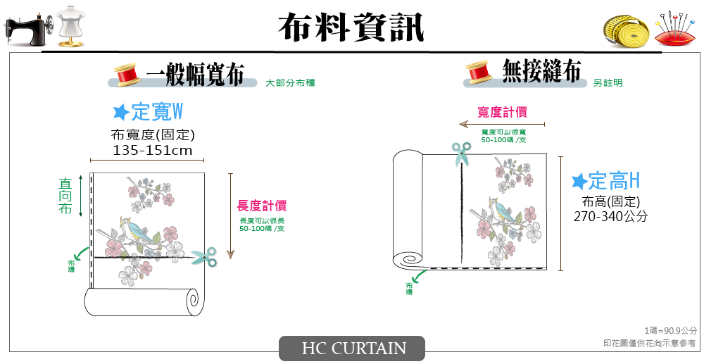 - 布料分成一般幅寬布與無接縫布料,兩者的花向和織法不同,若布料有花向時,需要特別注意。