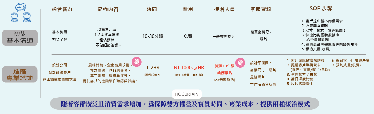 - 確認門市預約模式:初步基本溝通 or 專業進階諮詢
