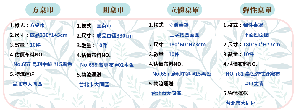 請見⇒桌巾訂做布種 ,提供布種NO. 色號