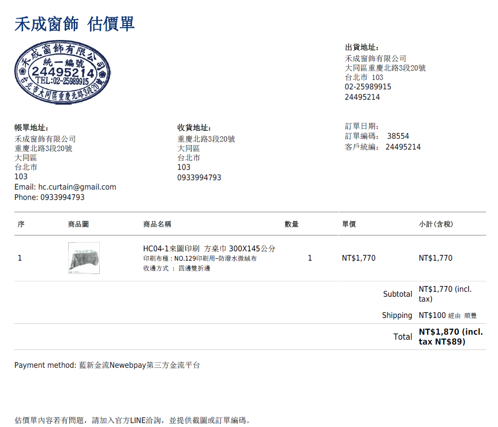 公司行號需要先索取估價單者,結帳時請選擇超商代碼或超商條碼,完成訂單後,會出現訂購資料,可列印或下載PDF訂單(估價單)(Invoice),因尚未完成付款流程,不會接單訂做。